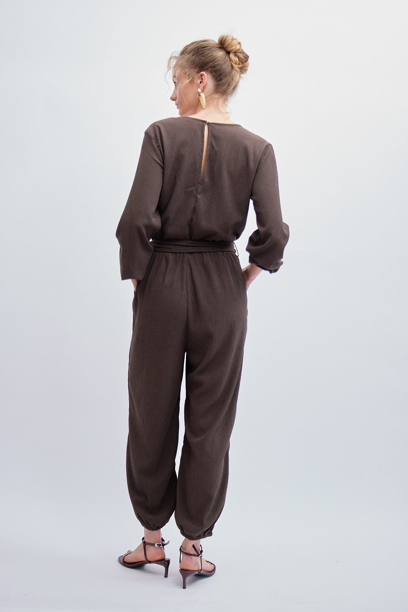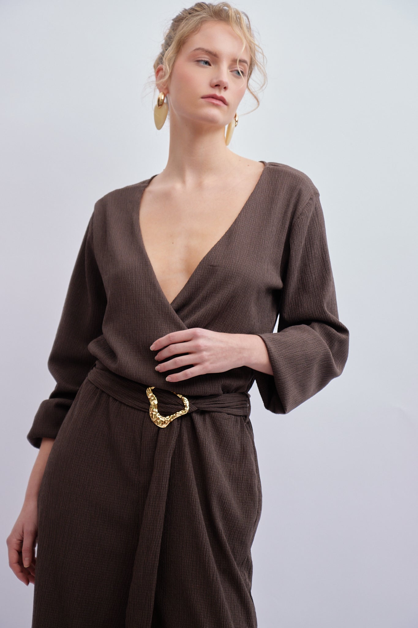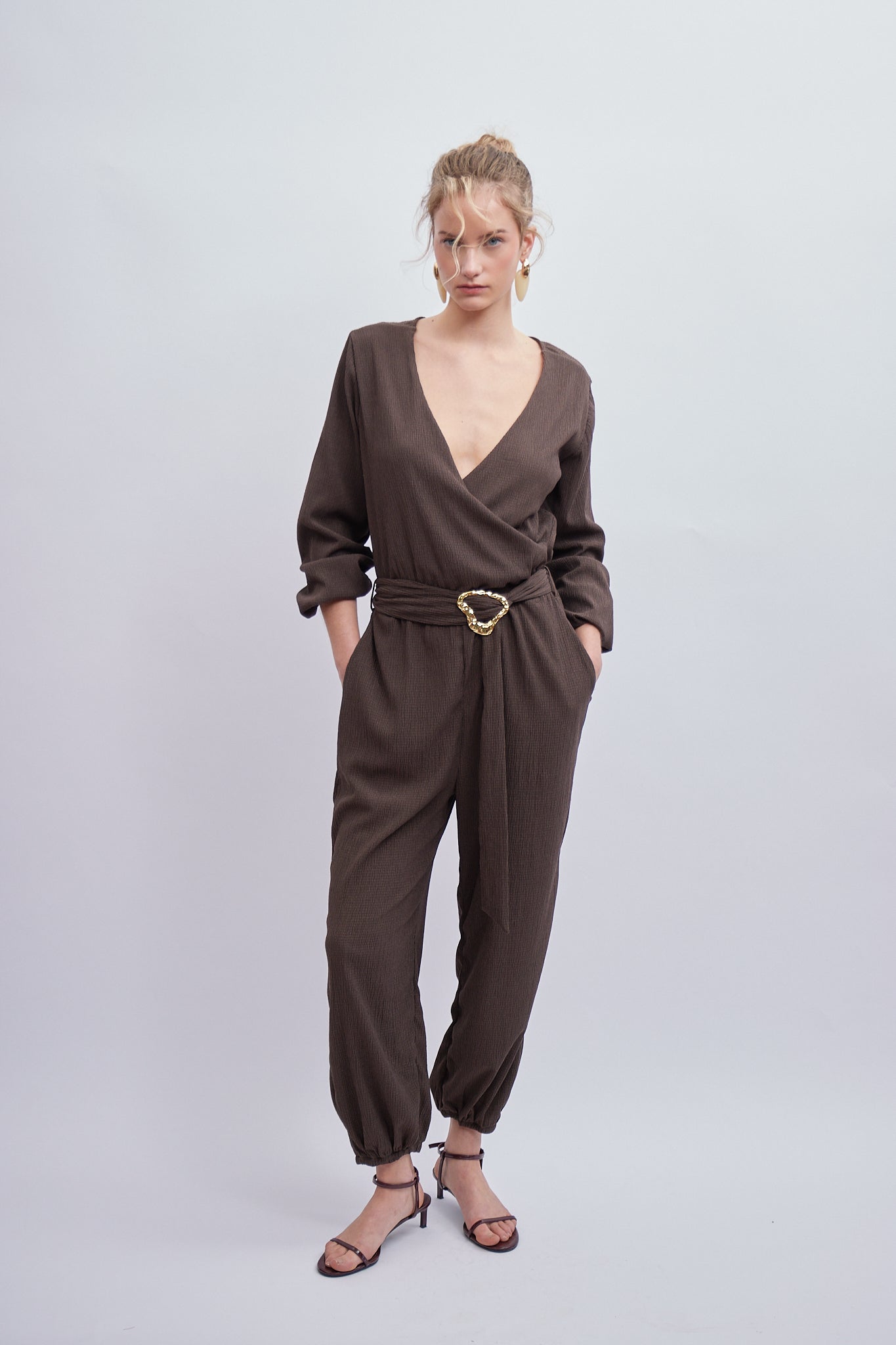 Nuestro Enterizo Lumen es la definición de la sofisticación contemporánea y el power dressing. Este enterizo café es una pieza statement con un elegante escote en V cruzado y un cinturón con hebilla dorada que define la cintura. El elástico en la bota crea un volumen chic y moderno. La base textil texturizada le da un acabado de lujo.