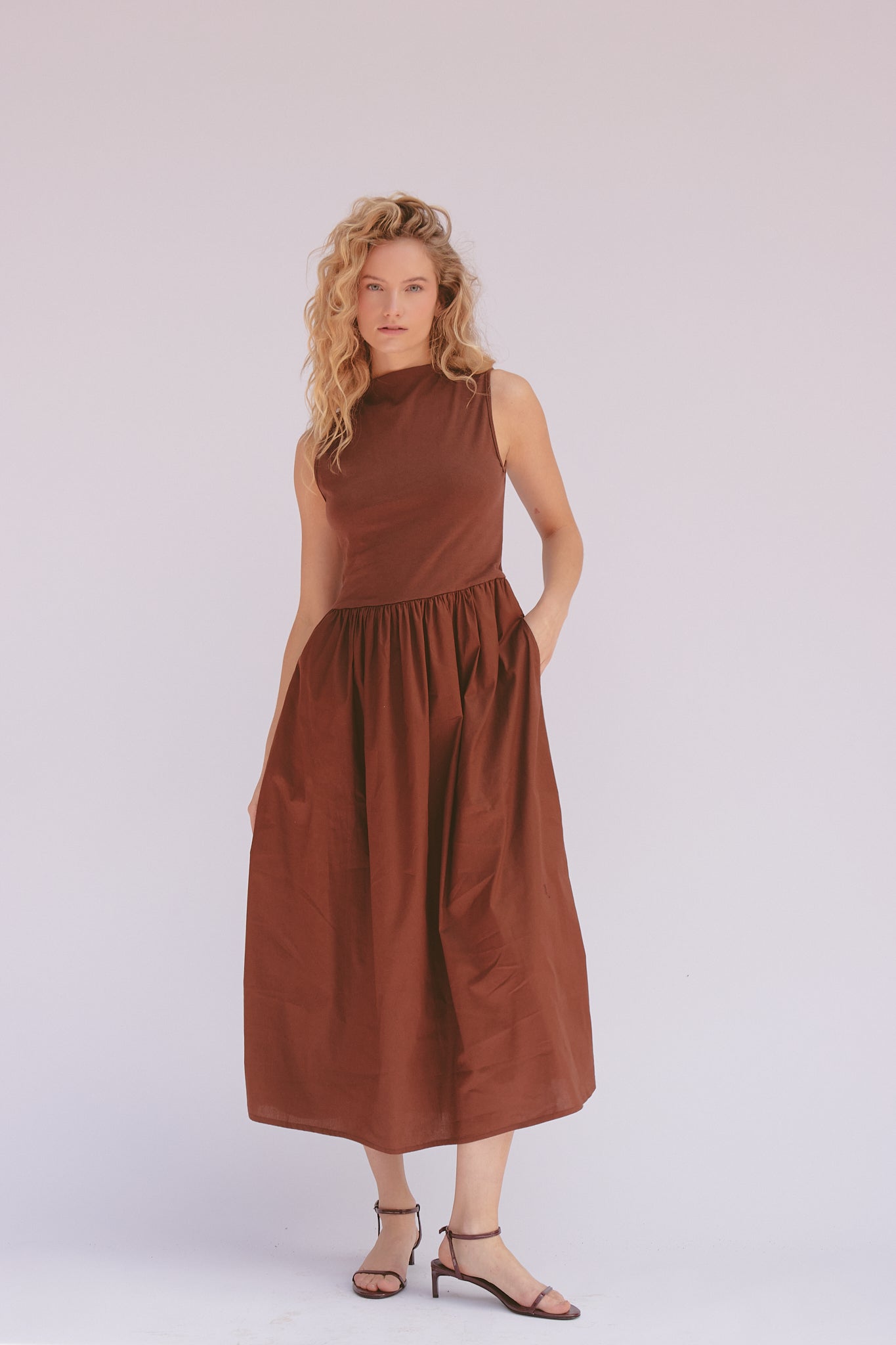 Nuestro Vestido Aria irradia elegancia natural con un twist de diseño textural. Este vestido largo café presenta una silueta chic con cuello alto y manga sisa, ideal para la versatilidad del día a la noche. La mezcla de materiales de punto y plano añade un detalle de sofisticación contemporánea. Los bolsillos funcionales suman confort.