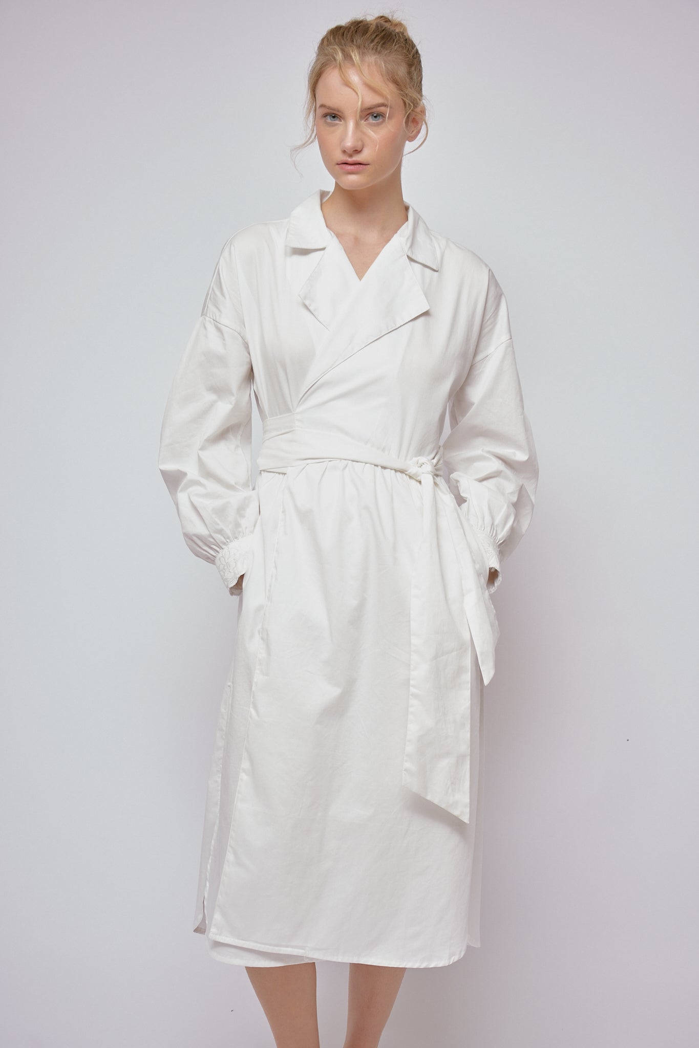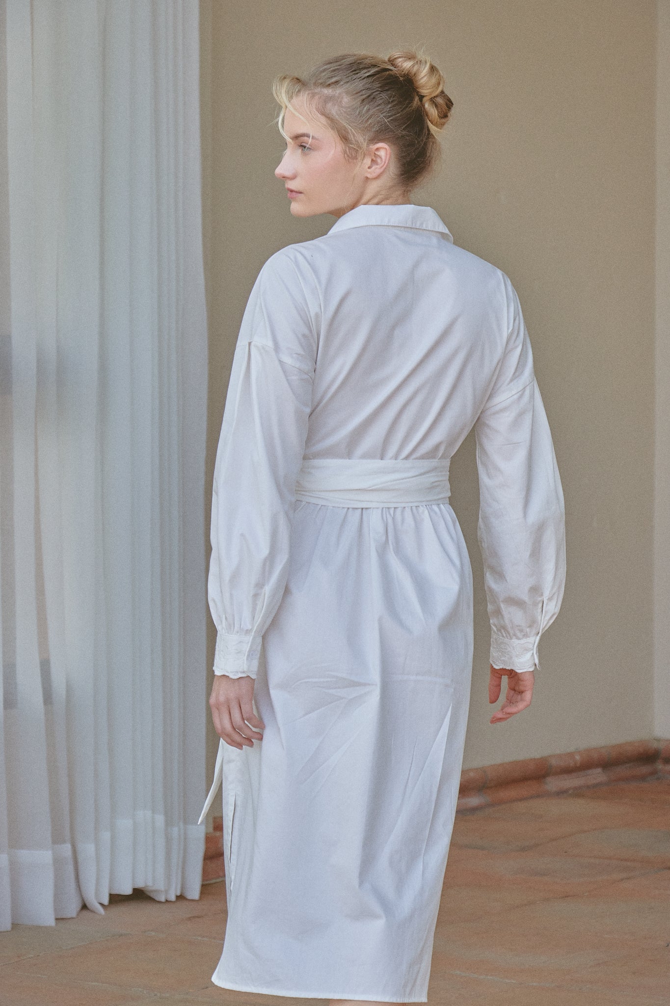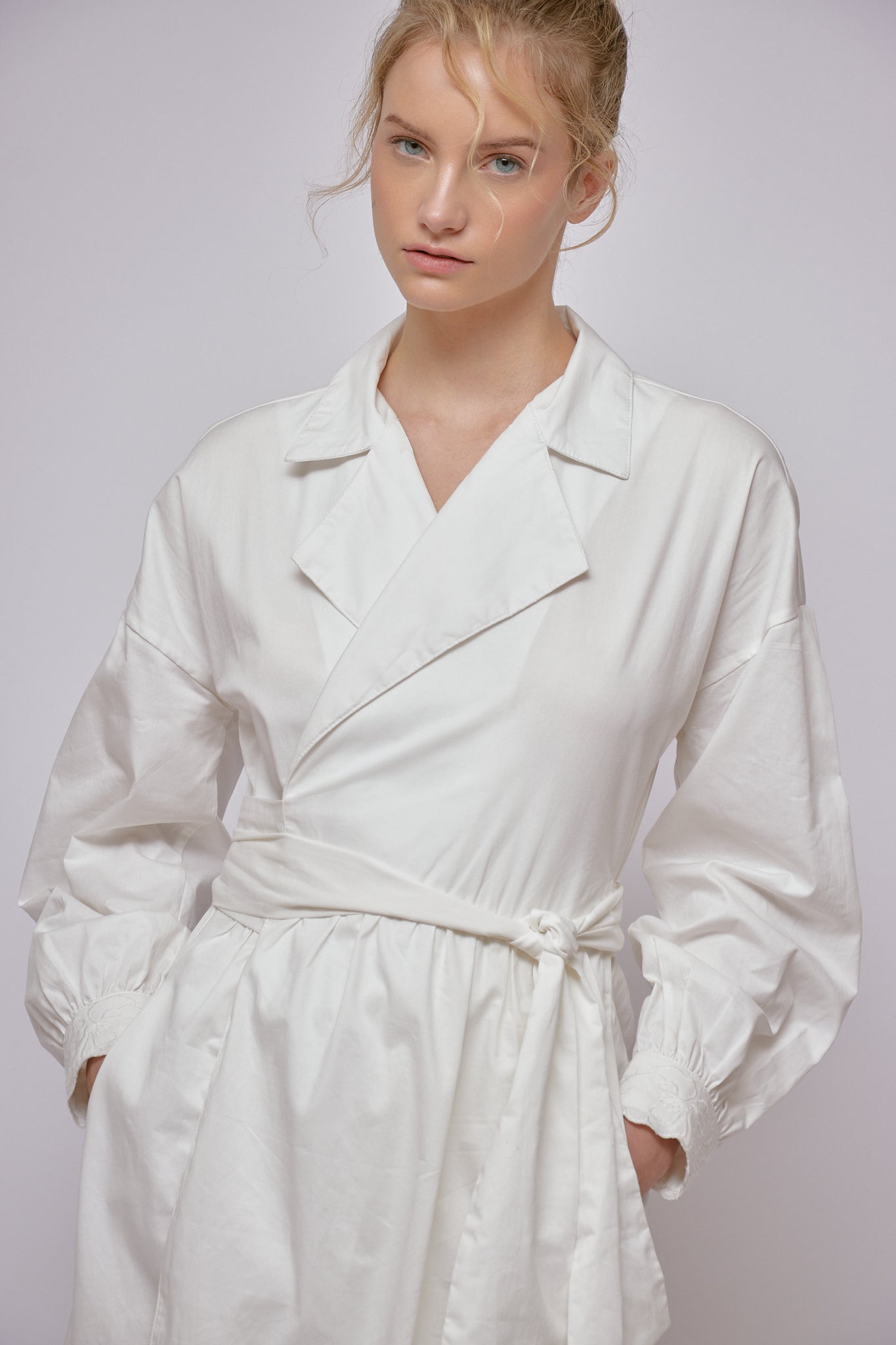 Nuestro Vestido Iris es el esencial de estilo aspiracional que fusiona el diseño chic con el confort del algodón. Este vestido mini envolvente ivory es una pieza versátil con un elegante cuello smoking y un cinturón para anudar que define la cintura. El detalle romántico se encuentra en los puños de la manga larga, adornados con un delicado bordado.