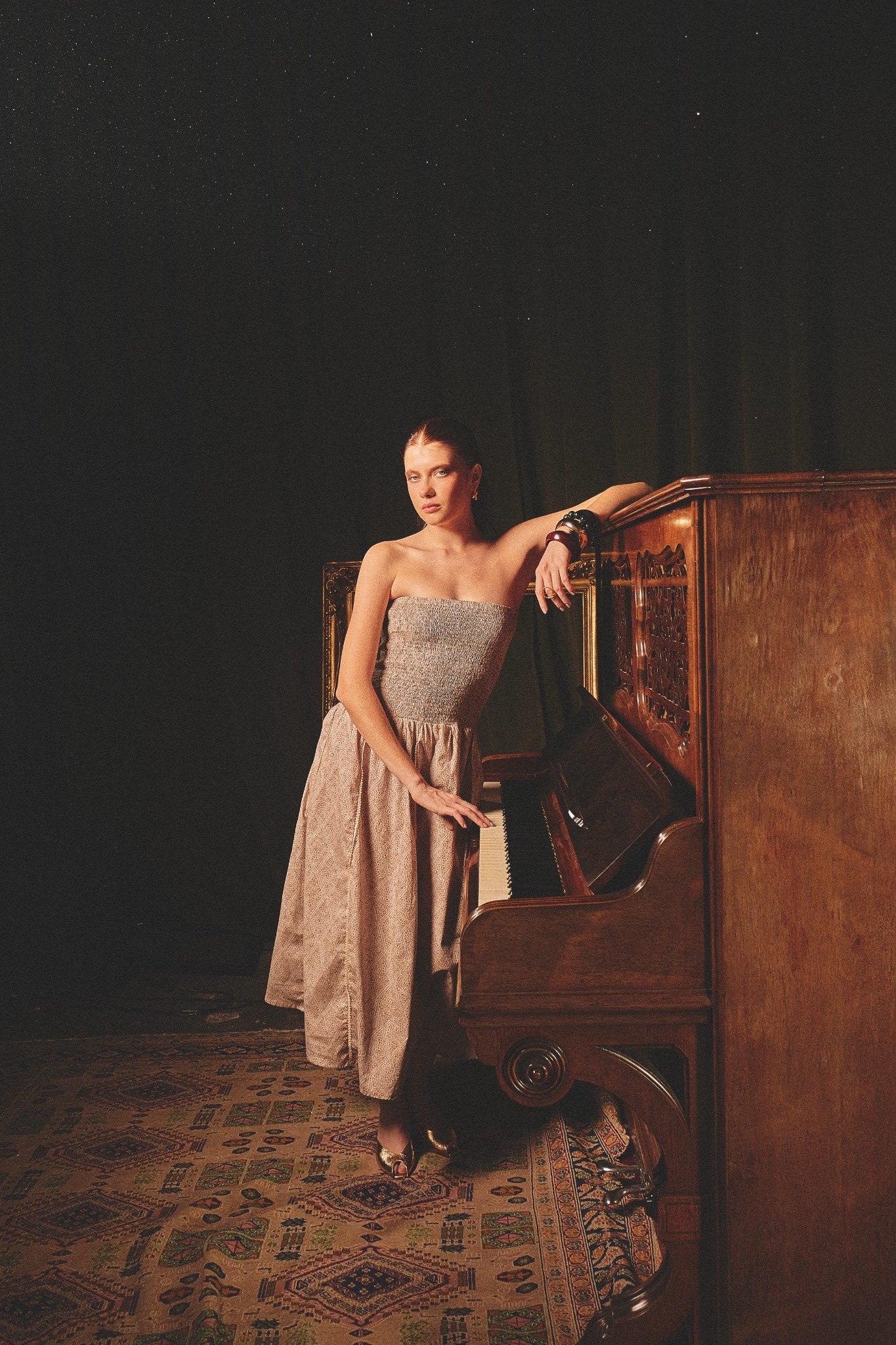 Nuestro Vestido Kari irradia estilo aspiracional con un print moderno y chic. Este vestido strapless estampado kaki midi presenta un elegante escote palabra de honor y un top enresortado que define el busto. La falda amplia con cortes y bolsillos en los costados crea una silueta dinámica y sofisticada.
